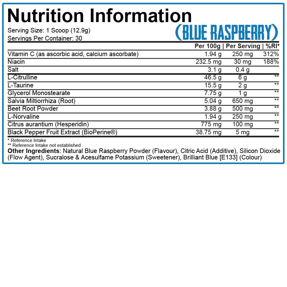 - **L-Citrulline:** Verhoogt de stikstofmonoxideproductie voor verbeterde bloeddoorstroming en spierpompen.