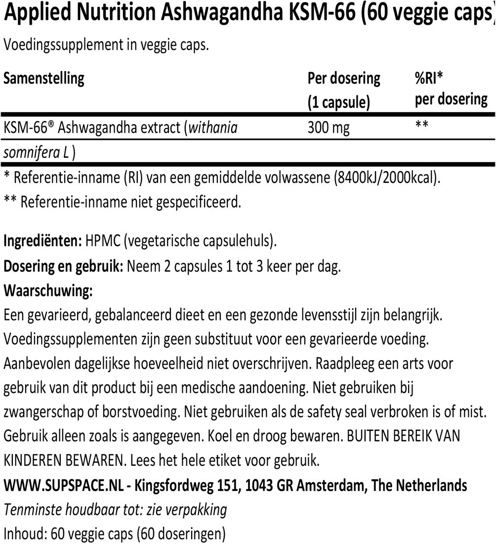 Applied Nutrition Ashwagandha KSM-66 is een hoogwaardig supplement dat gebruik maakt van KSM-66, een van de meest onderzochte en gepatenteerde vormen van Ashwagandha. Dit krachtige kruid staat bekend om zijn adaptogene eigenschappen, wat betekent dat het helpt het lichaam aan te passen aan stress en tegelijkertijd de algehele fysieke en mentale gezondheid bevordert.