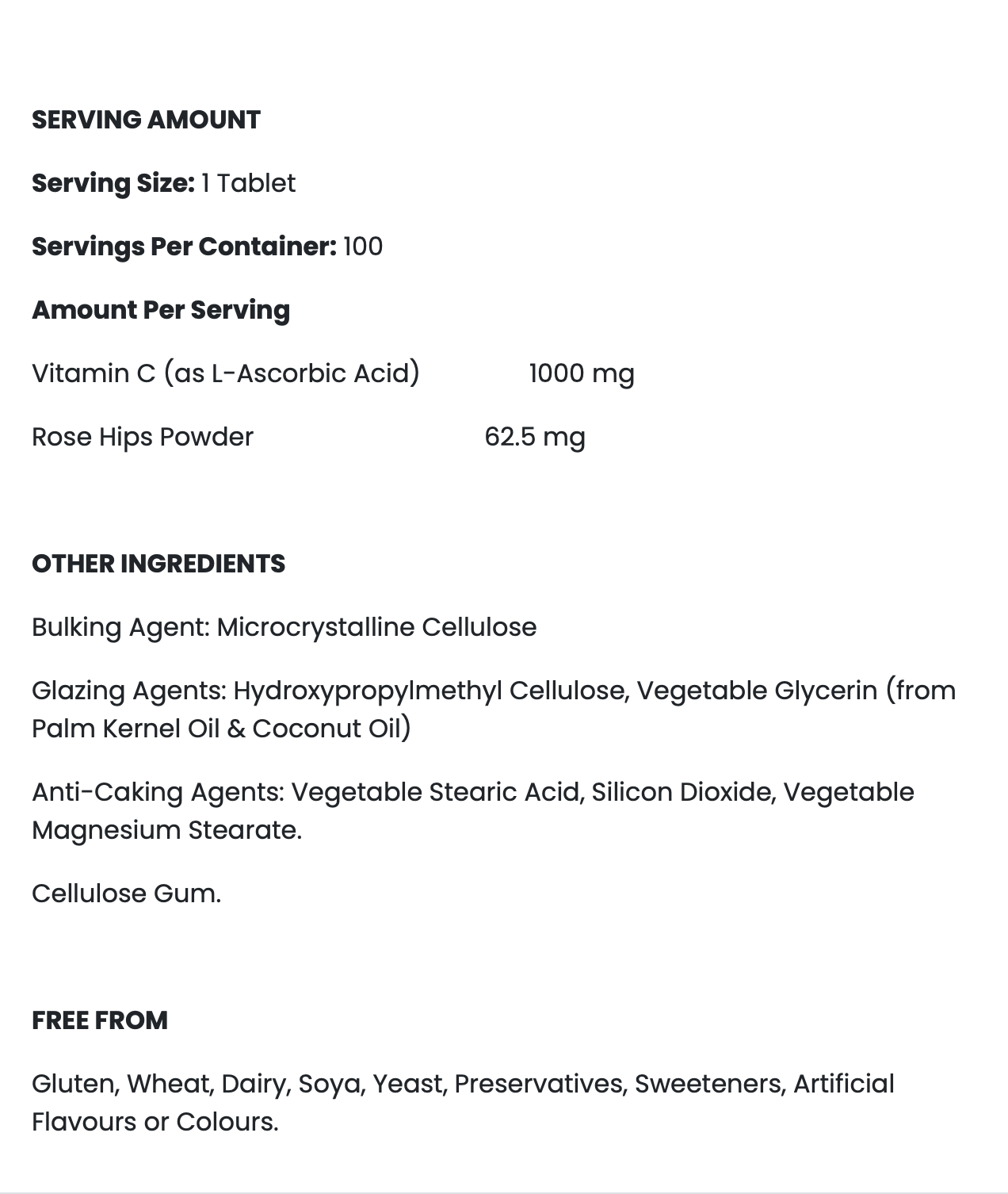 • Bevat 1000 mg vitamine C per tablet, wat voldoende is om aan de dagelijkse behoefte te voldoen.