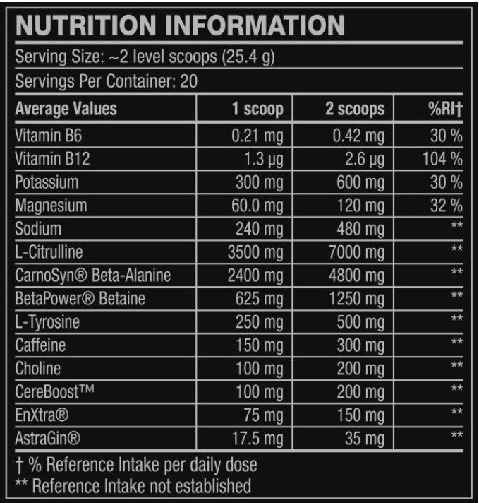 - Caffeine Anhydrous (300 mg): Zorgt voor een intense energieboost en verhoogde mentale focus.