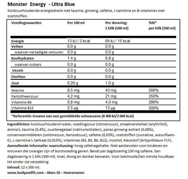 Monster Energy Ultra is een suikervrije energiedrank ontworpen voor mensen die een krachtige energieboost nodig hebben zonder extra calorieën of suiker. Deze versie van Monster Energy biedt dezelfde hoeveelheid cafeïne en andere energieleverende ingrediënten als de originele Monster Energy-drank, maar in een lichtere, verfrissende formule met minder zoetheid. Monster Energy Ultra is perfect voor mensen die hun energieniveau willen verhogen voor een workout, werkdag, of gewoon een drukke dag, zonder de extra calorieën die gepaard gaan met reguliere energiedranken.
