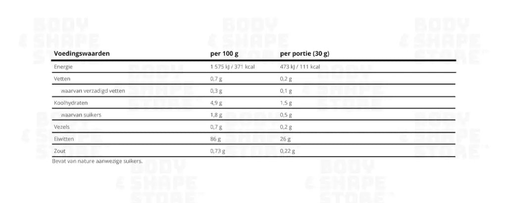 - **Wei-eiwitisolaat (CFM):** Hoogwaardige eiwitbron die snel door het lichaam wordt opgenomen.