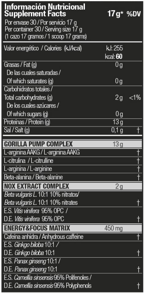 - Gorilla Pump Complex: Bevat L-arginine AAKG, L-citrulline, L-arginine en beta-alanine voor maximale spierpomp en uithoudingsvermogen.